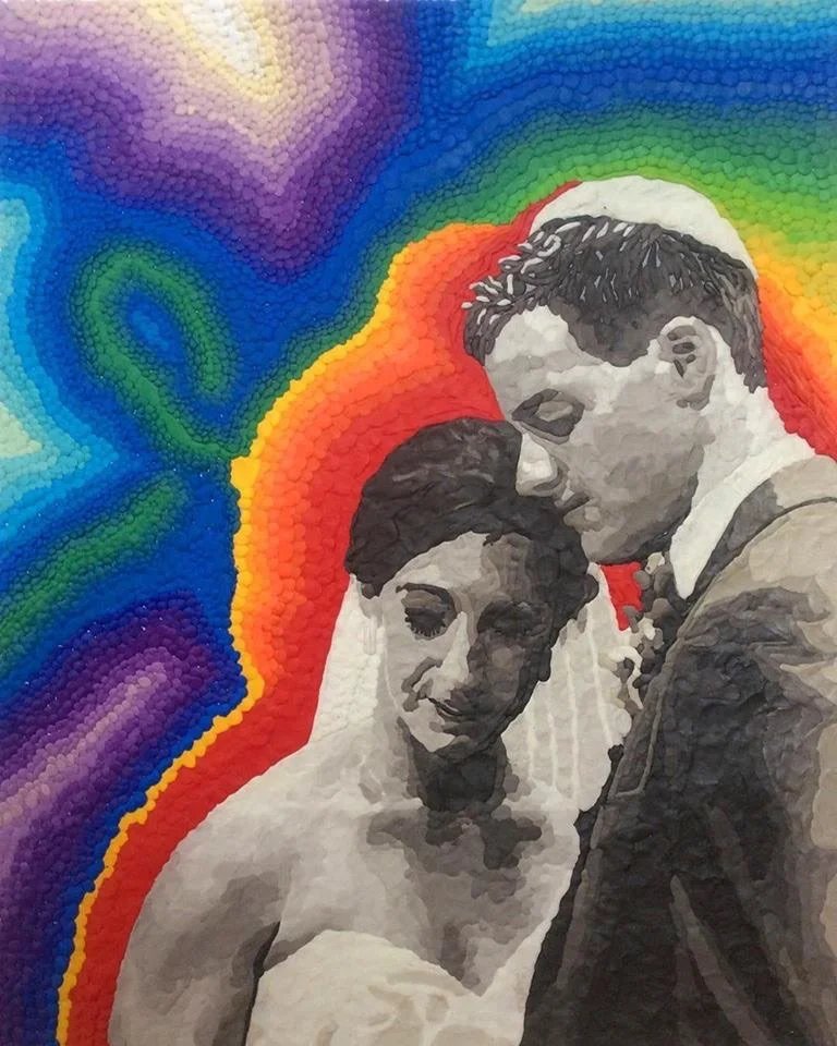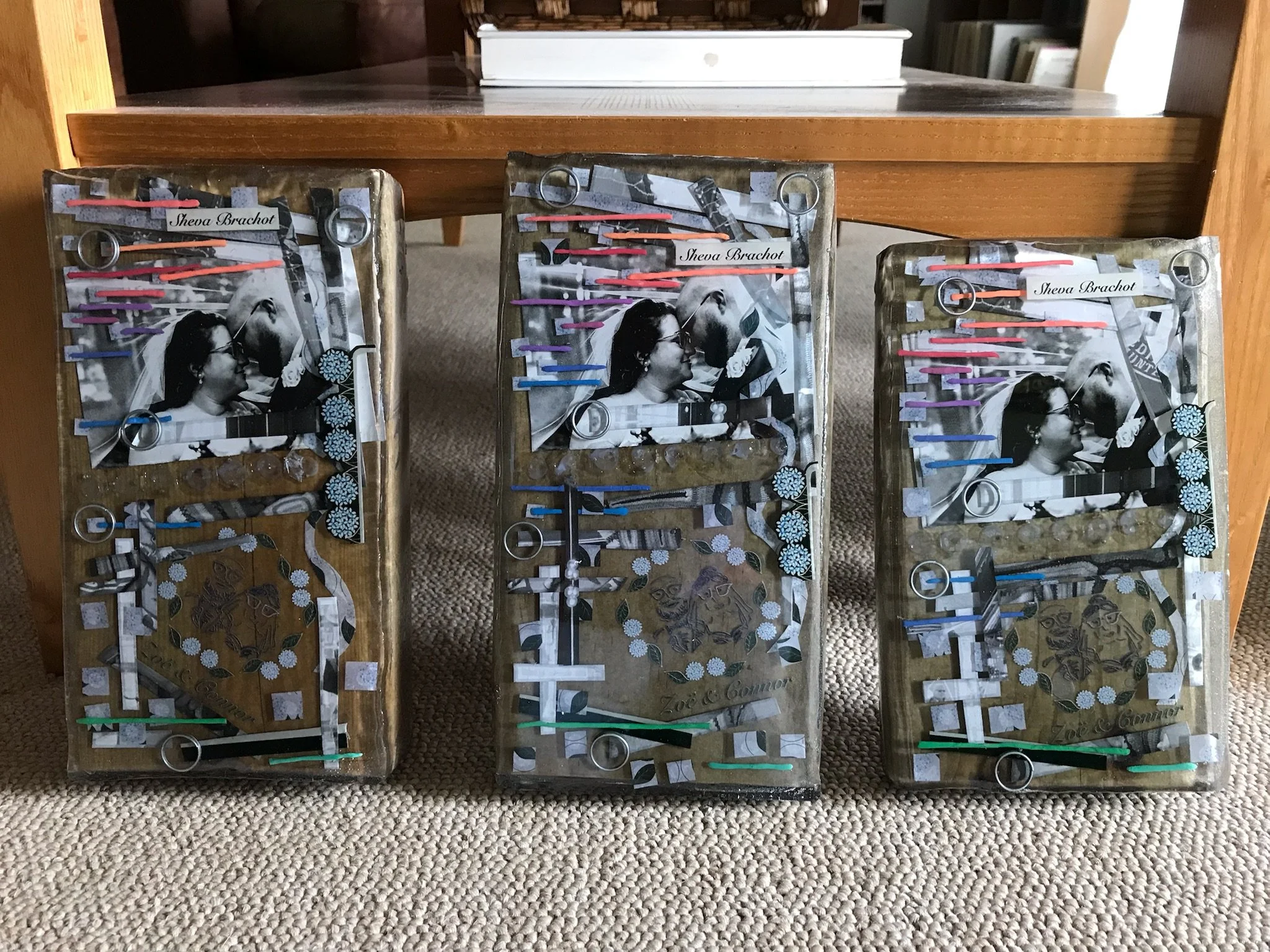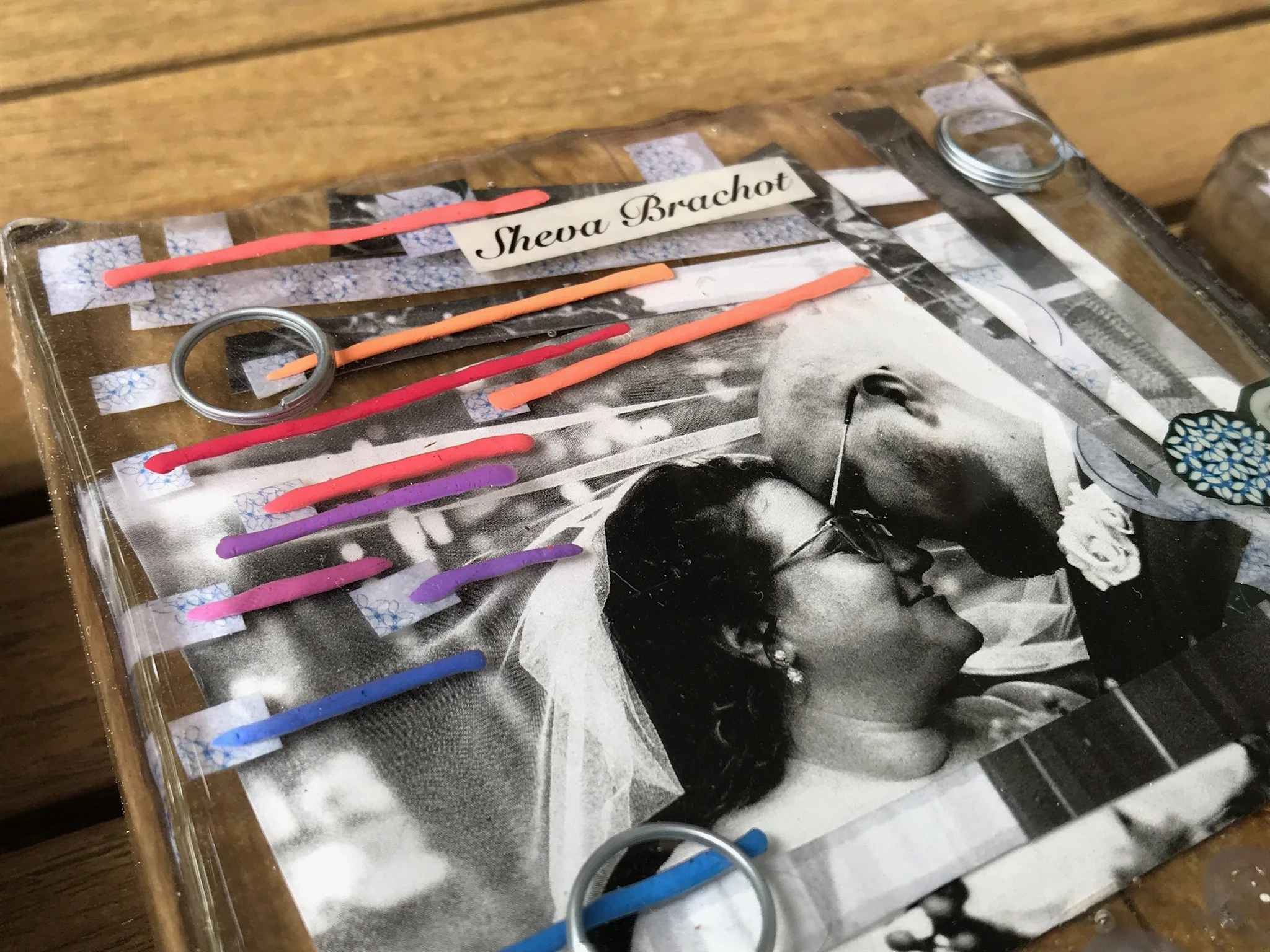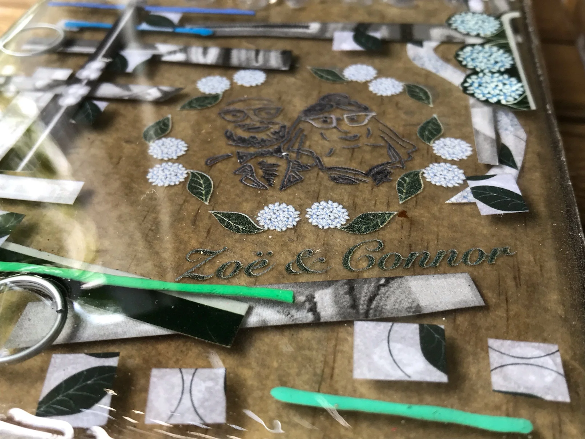 Wedding Portrait. Found Objects. Collage. Platalina Clay. Epoxy Resin. (This piece was made by using sentimental objects collected by the customer.)