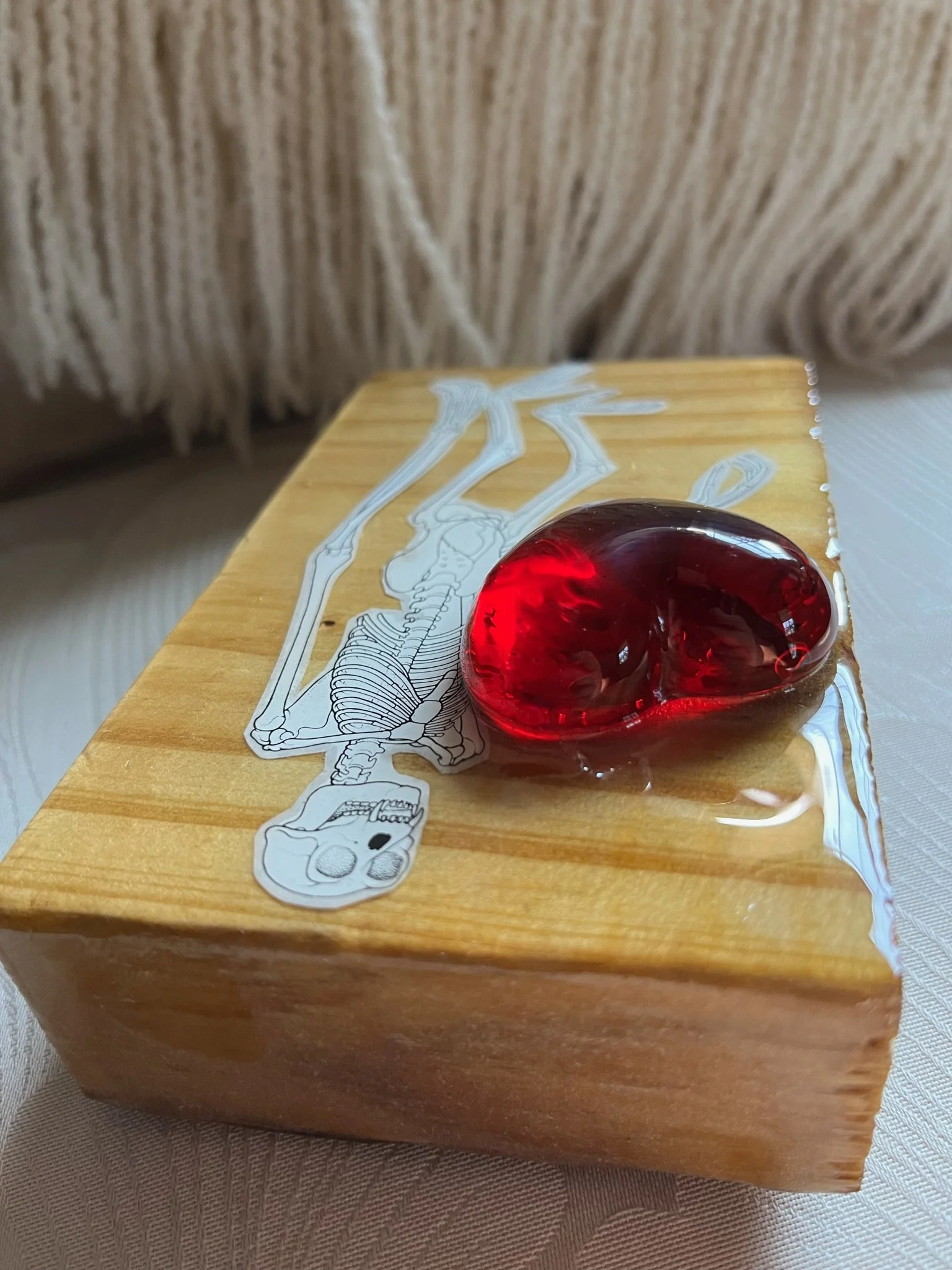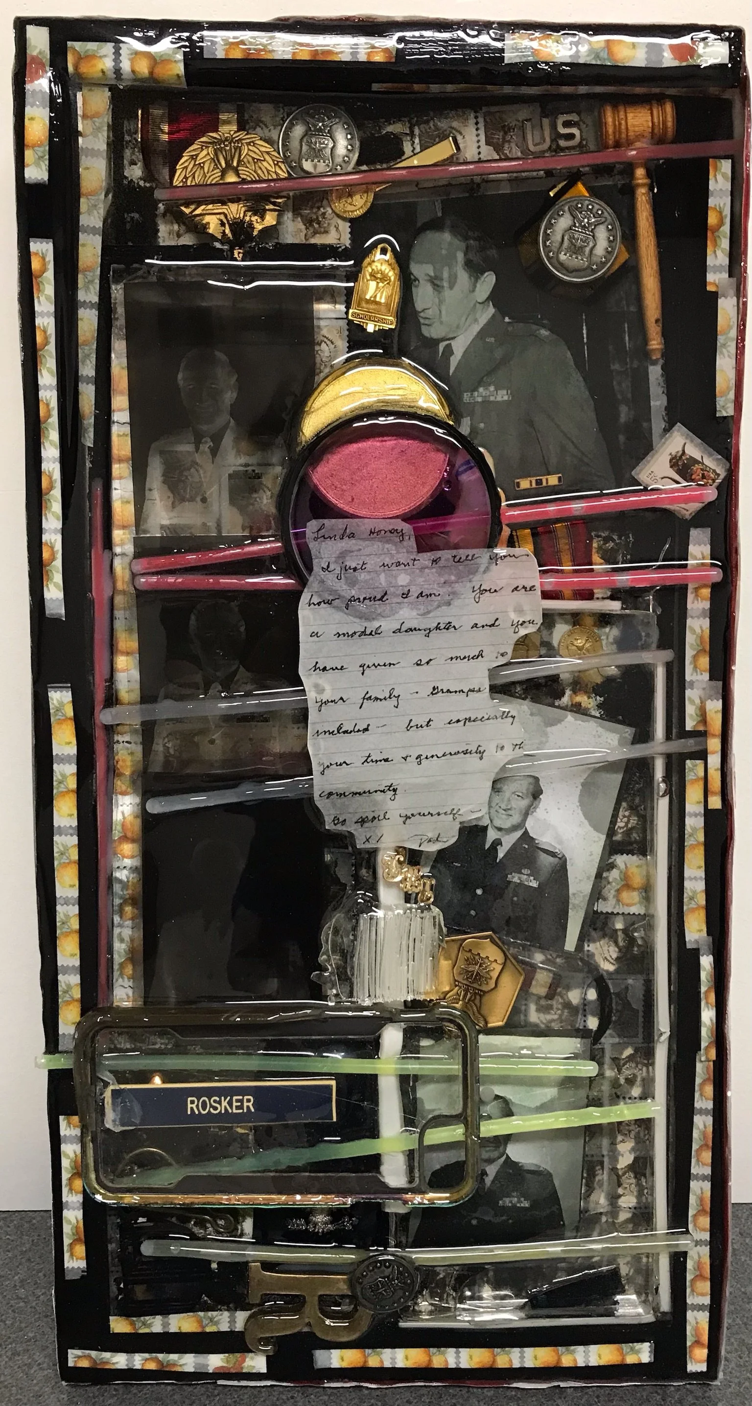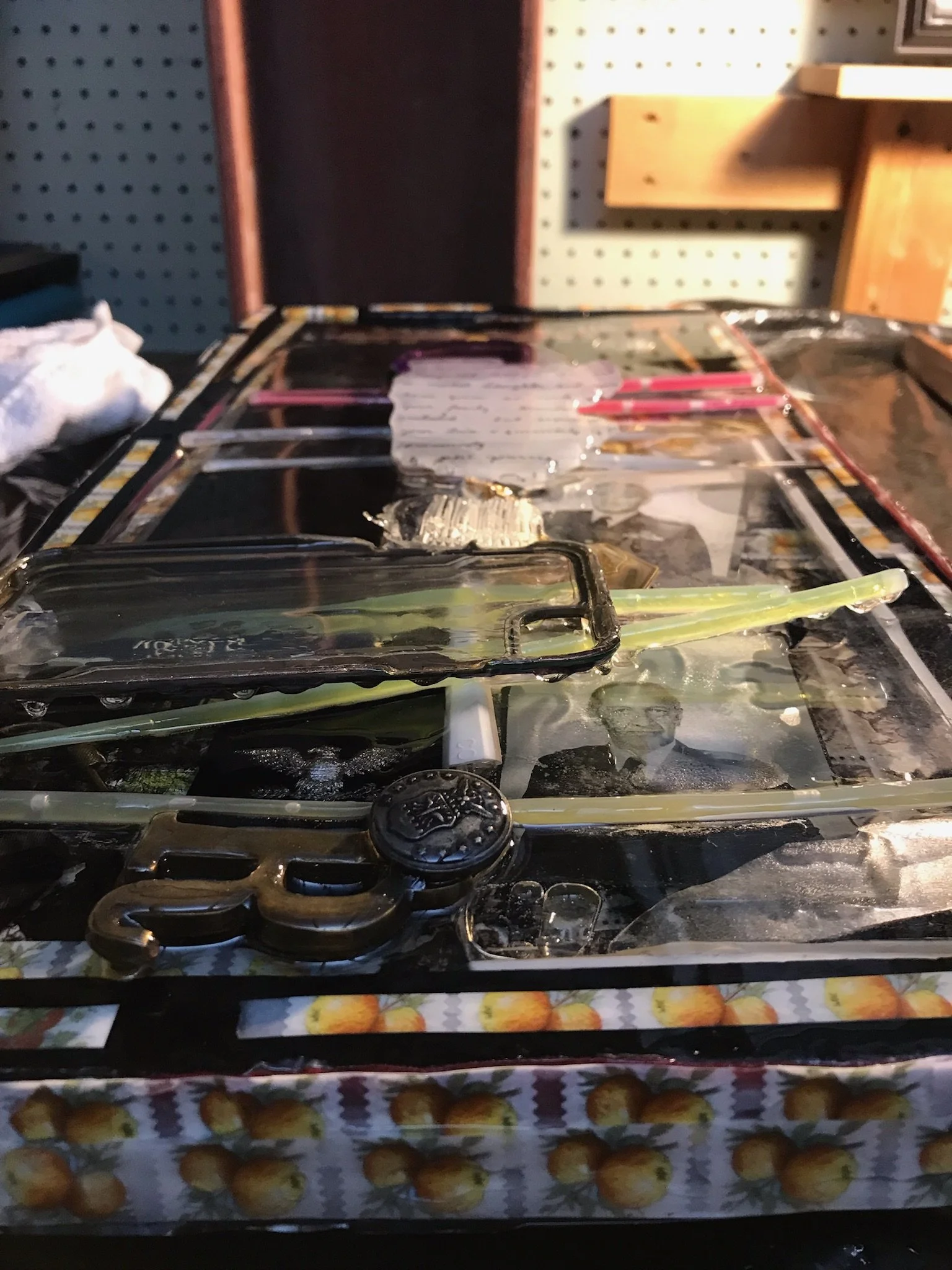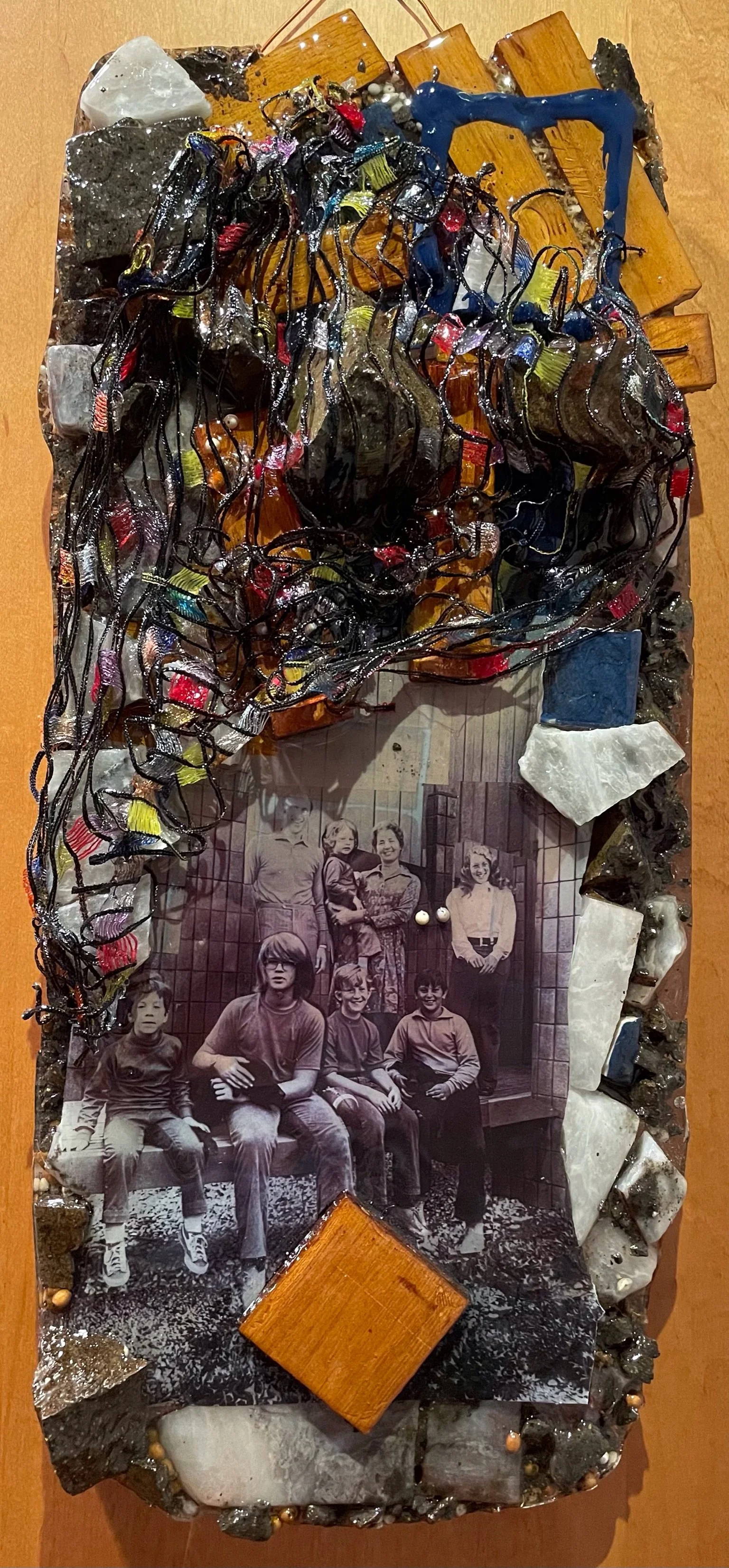 Family Portrait. Found Objects. Collage. Paint. Epoxy Resin. (This piece was made by using sentimental objects collected by the customer.)